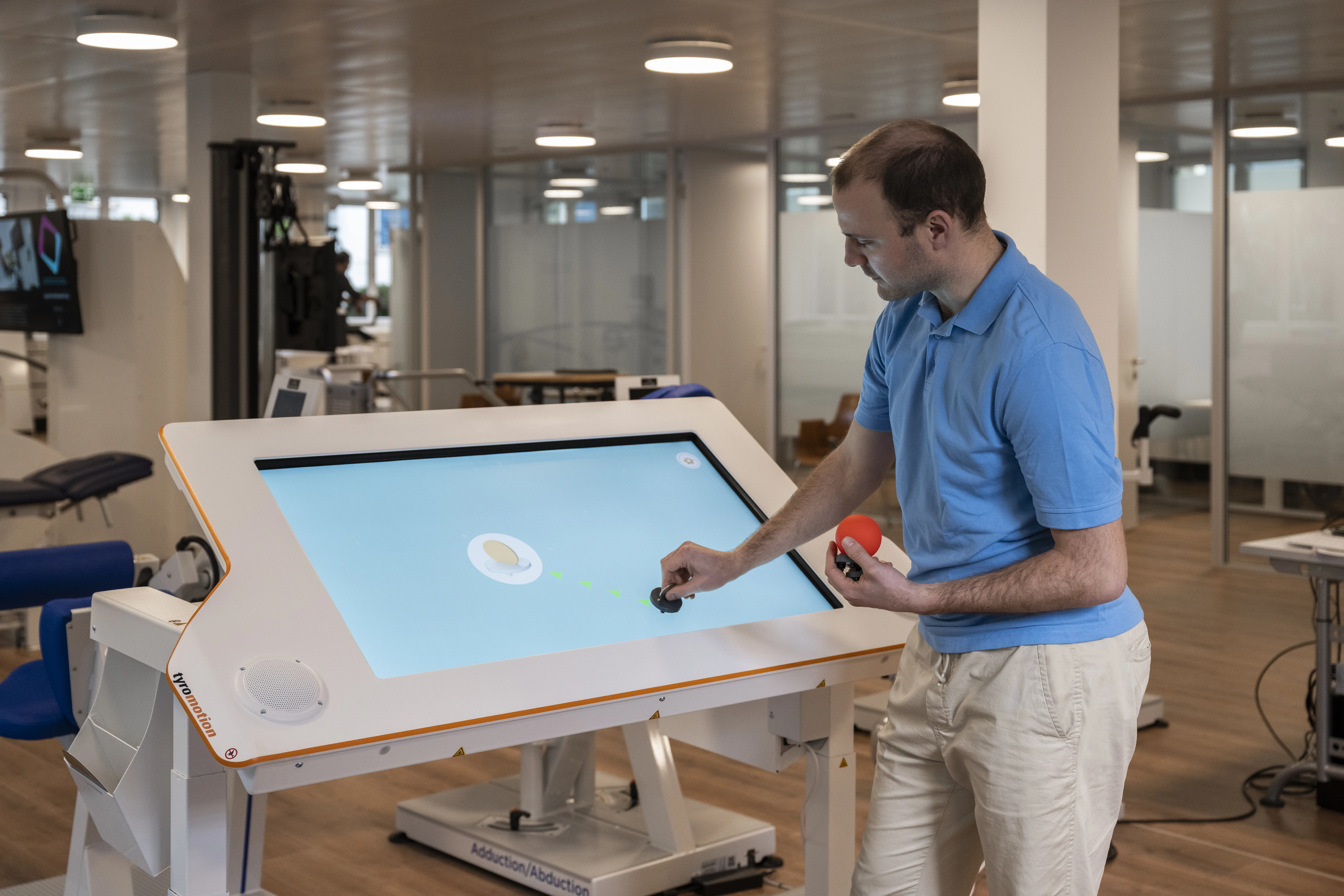 Im vorderen Teil des Trainingsraums sind Geräte der Arm-Welt platziert. Am Bildschirm oder am Gerät selbst lassen sich funktionelle Bewegungen üben; Patientinnen und Patienten arbeiten hier aber auch an der Mobilität und der Feinmotorik der oberen Extremitäten, des Oberkörpers und des Rumpfs.
